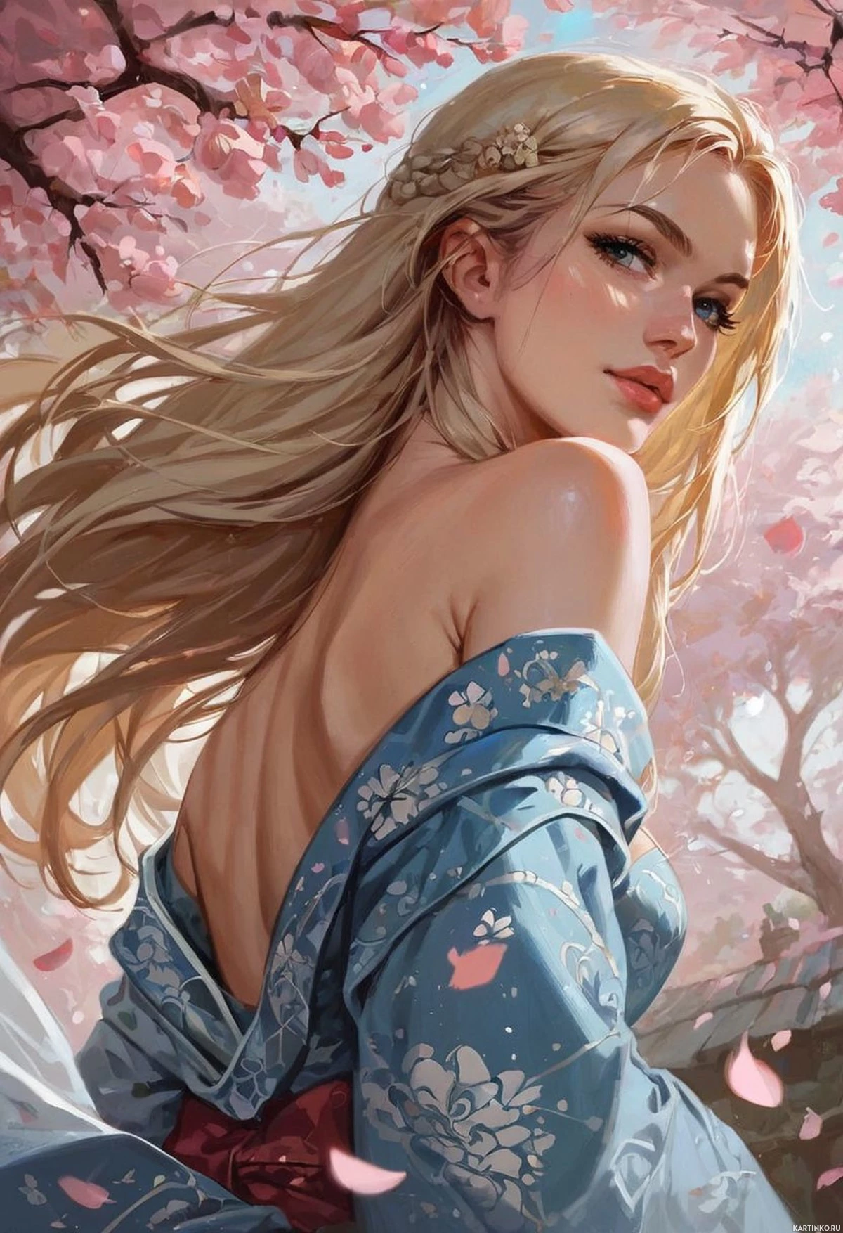 На картинке изображена девушка с светлыми волосами, выполненная в иллюстративном стиле, характерном для фэнтези-арта или дизайна видеоигр. У неё стройная фигура, а на голове – повязка, удерживающая длинные, распущенные волосы. Её взгляд направлен в сторону, она одета в детализированный синий наряд со сложными узорами, напоминающими цветочные мотивы, и, возможно, элементами традиционной японской одежды, такими как кимоно или оби. На заднем плане – роща цветущих вишен против яркого неба с лёгкими облаками, создавая ощущение спокойной весенней атмосферы. В целом, композиция передаёт чувство изящества и безмятежной красоты.