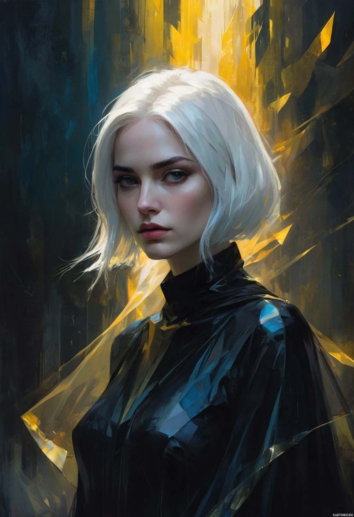 На картинке изображена девушка с белыми волосами, подстриженными в короткий боб, со светлой кожей. У неё тёмный макияж глаз, она слегка прищурена. Губы слегка подкрашены, на лице нейтральное выражение. Героиня одета в чёрный кожаный костюм, выполненный в футуристическом стиле, с множеством деталей и текстур, придающих ему вид брони. На костюме видны сложные узоры или элементы, возможно, указывающие на высокотехнологичные материалы или передовые дизайнерские решения. На заднем плане – абстрактные формы и цвета, включая, кажется, трещины или осколки стекла тёмного оттенка, с одной стороны лица, переходящие в окружающую среду. С другой стороны головы – светящаяся секция с тёплым свечением, напоминающая проявление энергии или света. Картинка выполнена в очень детализированном и стилизованном стиле, что характерно для цифровой живописи. Общий стиль указывает на принадлежность к жанрам научной фантастики или фэнтези.