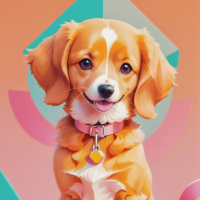 The image features an illustrated dog. It's a depiction of a puppy with a joyful expression, sitting on its hind legs and paws outstretched towards a colorful ball that appears to be floating in the air. The background is softly colored with pastel tones, which contributes to the overall cheerful and playful atmosphere of the illustration.