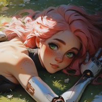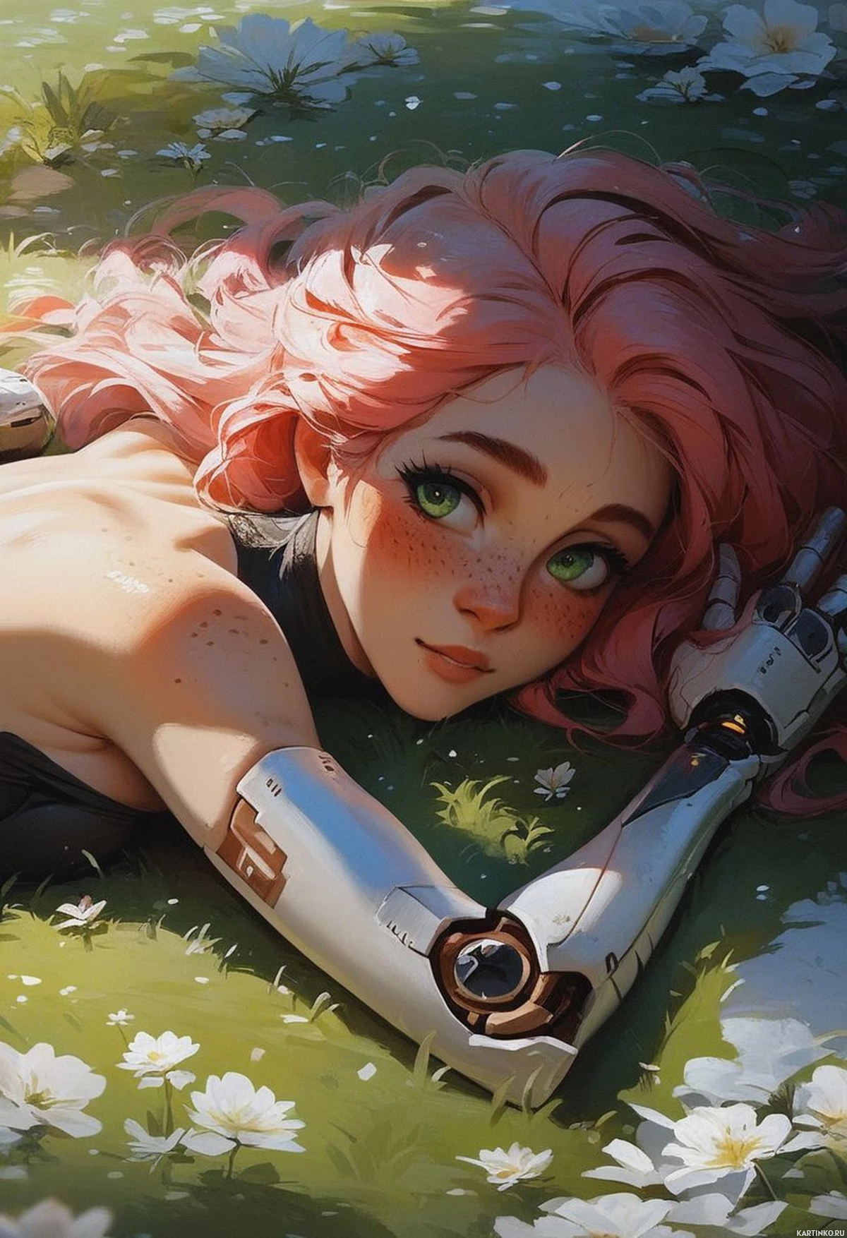 На картинке молодая девушка с розовыми волосами лежит на животе в поле ромашек. У неё прорисованные черты лица, включая закрытые глаза и губы. У неё бледная кожа, и на ней, похоже, топ или платье без рукавов. К одной руке прикреплён механический протез с видимыми металлическими деталями и схематичными узорами.