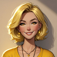 На картинке – молодая женщина с светлыми волосами, улыбается в камеру. У нее яркие голубые глаза, и она одета в жёлтую кофту. На шее – ожерелье с подвеской, добавляющее изящества её наряду. Руки она небрежно засунула в карманы джинсов. Фон нейтральный, чтобы акцент оставался на ней.