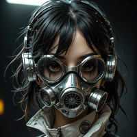 На картинке изображена женщина в стиле научной фантастики. У нее темные волосы и респиратор на лице, соединенный с тем, что похоже на баллон с кислородом или газом с левой стороны. Глаза красные, и она смотрит прямо в камеру. На ней – куртка с высоким воротником, с различными ремнями и пряжками, создающими ощущение утилитарной или боевой экипировки, а также перчатки, частично скрытые из виду. Фон размыт, но кажется, что это промышленное или подземное помещение, что перекликается с научно-фантастической эстетикой ее одежды и снаряжения.