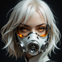 На картинке изображена девушка с белыми волосами в костюме, напоминающем футуристическую экипировку, и респиратором. У нее нейтральное, слегка серьезное выражение лица и яркие красные глаза. Стиль картинки отсылает к футуристической или альтернативной реальности, характерной для научно-фантастических жанров.