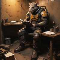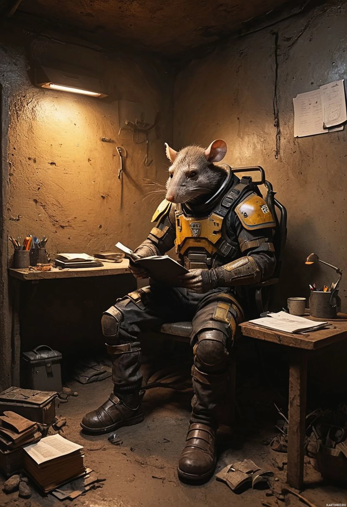 На картинке изображён антропоморфный крысёнок в футуристической броне, сидящий за столом, заваленным бумагами и всякими предметами. Крысёнок читает книгу, которая открыта. Справа от стола стоит лампа, освещающая пространство, а над ней висит табличка или листок бумаги, содержание которого трудно разобрать. По окружению видно, что это помещение, возможно, кабинет или офис, с бетонным полом и стенами, изношенные от времени.