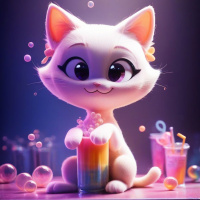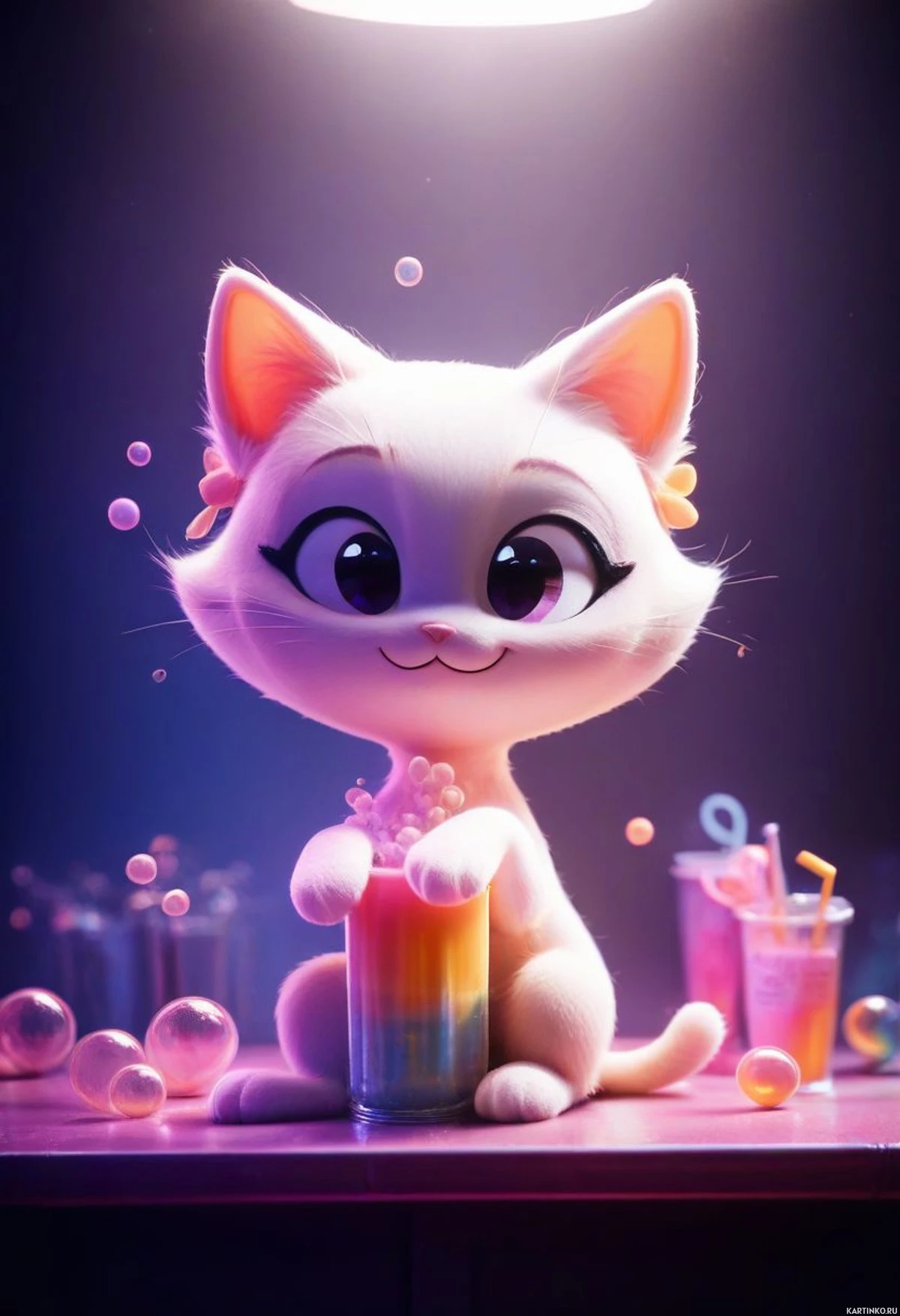 В центре картинки — очаровательный котенок с голубыми глазами и розовым бантом на голове, сидит за столом. Он держит лапками разноцветный напиток. Вокруг котенка — множество других ярких напитков и сладостей, разбросанных по столу. Повсюду плавают пузырьки, создающие ощущение веселой и игривой атмосферы. Общее впечатление от картинки – яркое и сказочное.
