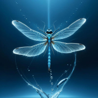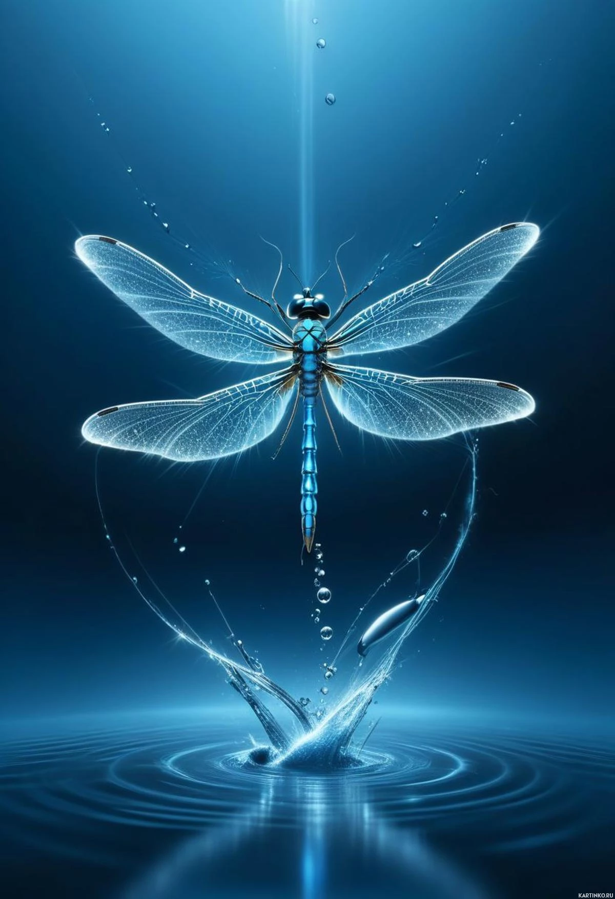 На картинке – стрекоза в полёте, застывшая между двумя каплями воды с рябью. Фон тёмный, возможно, синий или чёрный, что создаёт резкий контраст, выделяя стрекозу и окружающие её капли.
