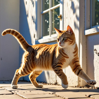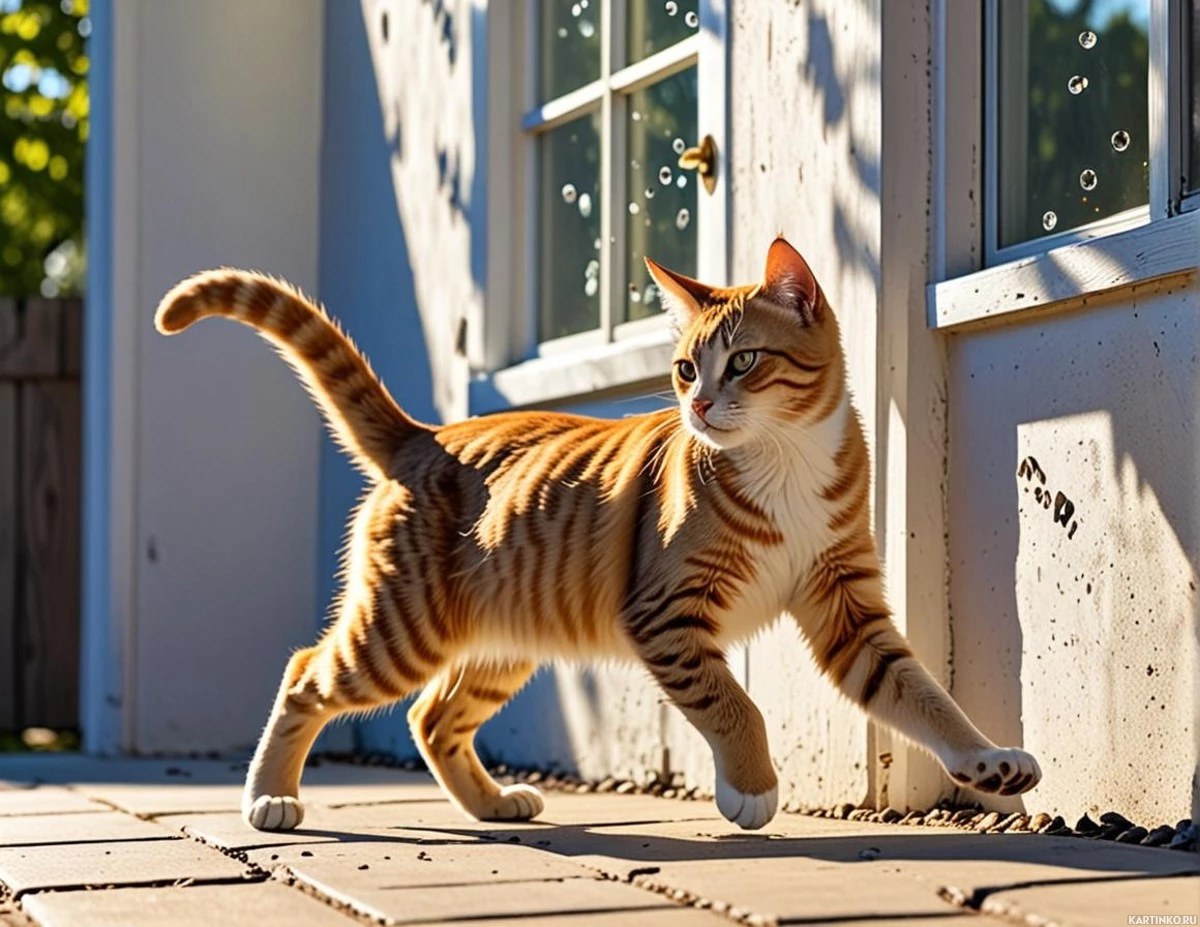 На картинке – полосатый кот с шерстью разных оттенков: оранжевого, черного и белого. У кота очень любопытный вид, уши навострены, а глаза направлены на что-то за кадром. Он стоит на патио, где видны тени, будто солнце светит. Слева в кадре – часть стены, предположительно дома или здания.