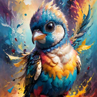 The image features a vividly colored parrot perched on a branch against a backdrop that includes what appears to be an aurora-like phenomenon or a burst of colorful light. The bird is depicted with a detailed plumage, showcasing shades of blue, yellow, and red on its wings, body, and head. It has large, expressive eyes and a pointed beak, which are typical characteristics of parrots. The overall style of the image leans towards fantasy or illustration art, characterized by bold colors and dynamic lighting effects that create an ethereal atmosphere. The background includes streaks of colorful energy or paint-like splashes, contributing to a dreamy and vibrant visual experience.