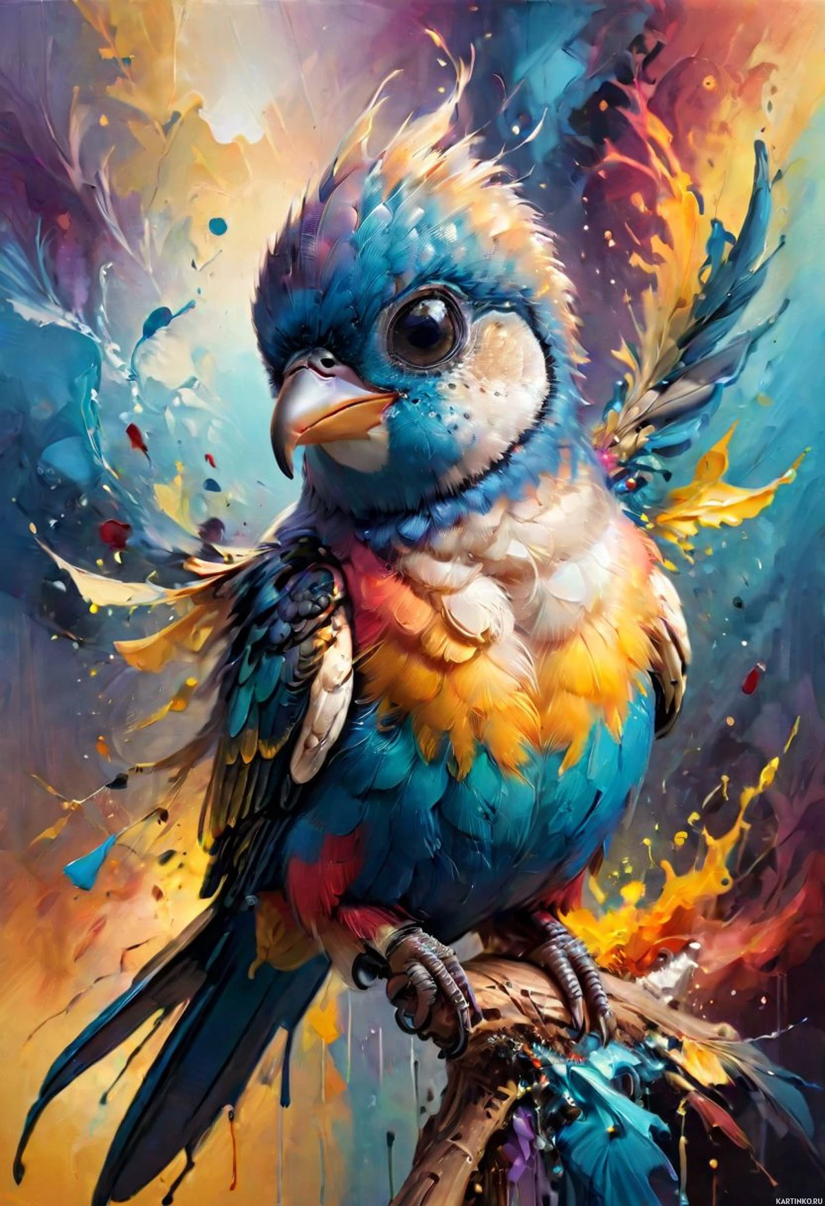 На картинке – ярко раскрашенный попугай, сидящий на ветке на фоне, похожего на северное сияние или взрыв цветного света. Перья птицы изображены с невероятной детализацией, демонстрируя оттенки синего, жёлтого и красного на крыльях, теле и голове. У попугая большие, выразительные глаза и клюв, характерные черты этих птиц. Стиль картинки тяготеет к фэнтези или иллюстрации, с использованием смелых цветов и динамичного освещения, создающего неземную атмосферу. На заднем плане – полосы цветной энергии или мазки, напоминающие краску, что добавляет картине мечтательности и яркости.