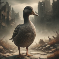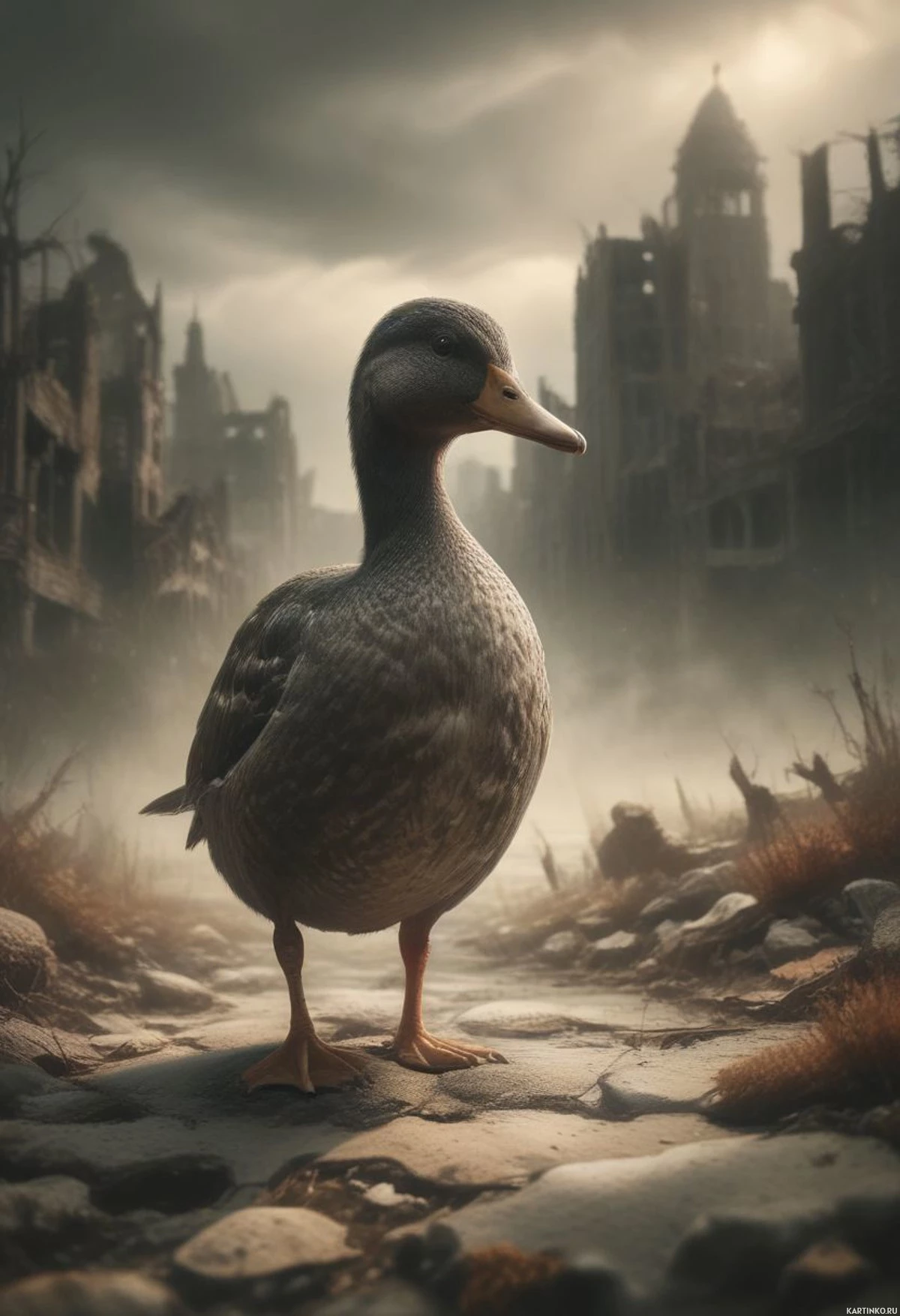 На картинке одинокая утка стоит на булыжной мостовой, в том, что похоже на постапокалиптический городской пейзаж. Окружающие утку здания несут следы разрушений и заброшенности: повсюду битый кирпич, а строения выглядят изношенными и поврежденными. Небо над головой затянуто облаками, что усиливает ощущение запустения.