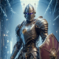 The image displays a character that combines elements of fantasy and robotics. It features a humanoid figure with a metallic body, adorned in armor that includes red and gold accents on the chestpiece and gauntlets. The character is holding a large shield and a sword, suggesting readiness for combat. The setting appears to be an interior space with stone walls and arches, possibly a castle or underground chamber. The lighting casts a dramatic shadow, highlighting the figure as the central subject of the image.