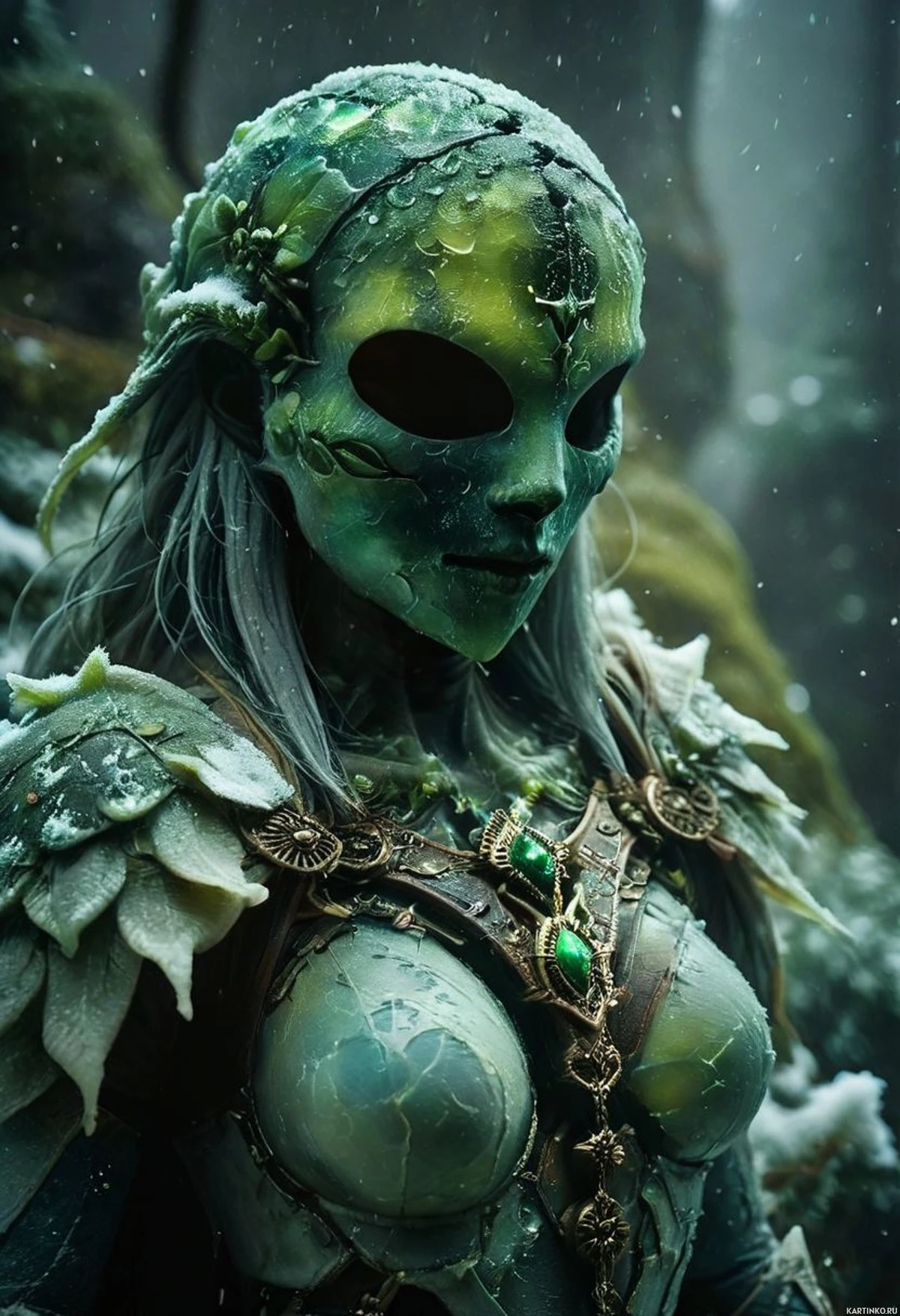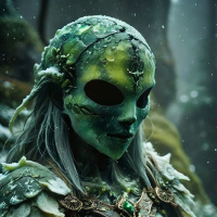 На картинке изображён персонаж в стиле фэнтези. У него кожа, напоминающая зелёный мох, большие белые глаза, излучающие свет, заострённые уши и сложный узор на лице, похожий на перья или кости. Он одет в нагрудник с узором, состоящим из стилизованных листьев или лоз, в тёмную одежду со светлыми акцентами и имеет браслет на руке. Фон размыт, но наводит на мысль о холодной, возможно снежной обстановке, которая контрастирует с тёплым свечением, исходящим от глаз и головы персонажа. Впечатление – это существо или хранитель, вероятно вдохновлённый мифологией или фэнтезийной литературой.