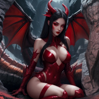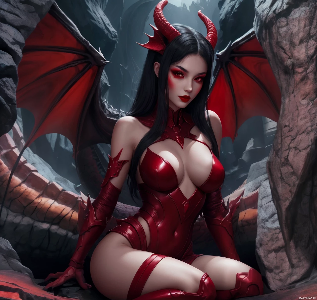 In the image, a woman with long black hair and red eyes is captured in a pose that exudes both elegance and the supernatural. She is adorned in a red and black outfit, which appears to be made of a material resembling skin. The wings attached to her back are also red and black, adding to her otherworldly appearance. Her legs are crossed at the knee, and she holds herself up with her hands resting on her thighs, suggesting an air of poise and confidence. She is seated on a throne that seems to be carved from stone or metal, with two dragons flanking it, their fiery forms adding a dynamic element to the scene. The background is dimly lit but reveals the silhouette of what appears to be ruins or an ancient structure, hinting at a setting steeped in history and mystery.