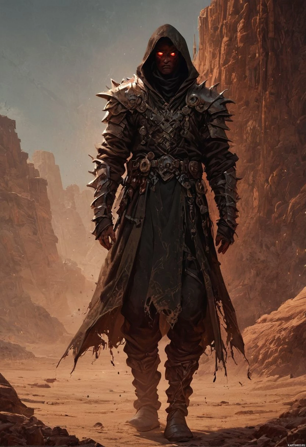 На этой картинке на переднем плане выделяется фигура в капюшоне. На человеке темные, богато украшенные доспехи с шипами и ремнями на торсе и плечах. Лицо скрыто капюшоном, что добавляет загадочности. На заднем плане простирается безжизненный пустынный пейзаж. Видны песчаные текстуры под ногами, а вдалеке – скальные образования, создающие ощущение необъятности пространства. Цветовая палитра картинки выполнена в земляных тонах, что подчеркивает общий фэнтезийный и суровый колорит.