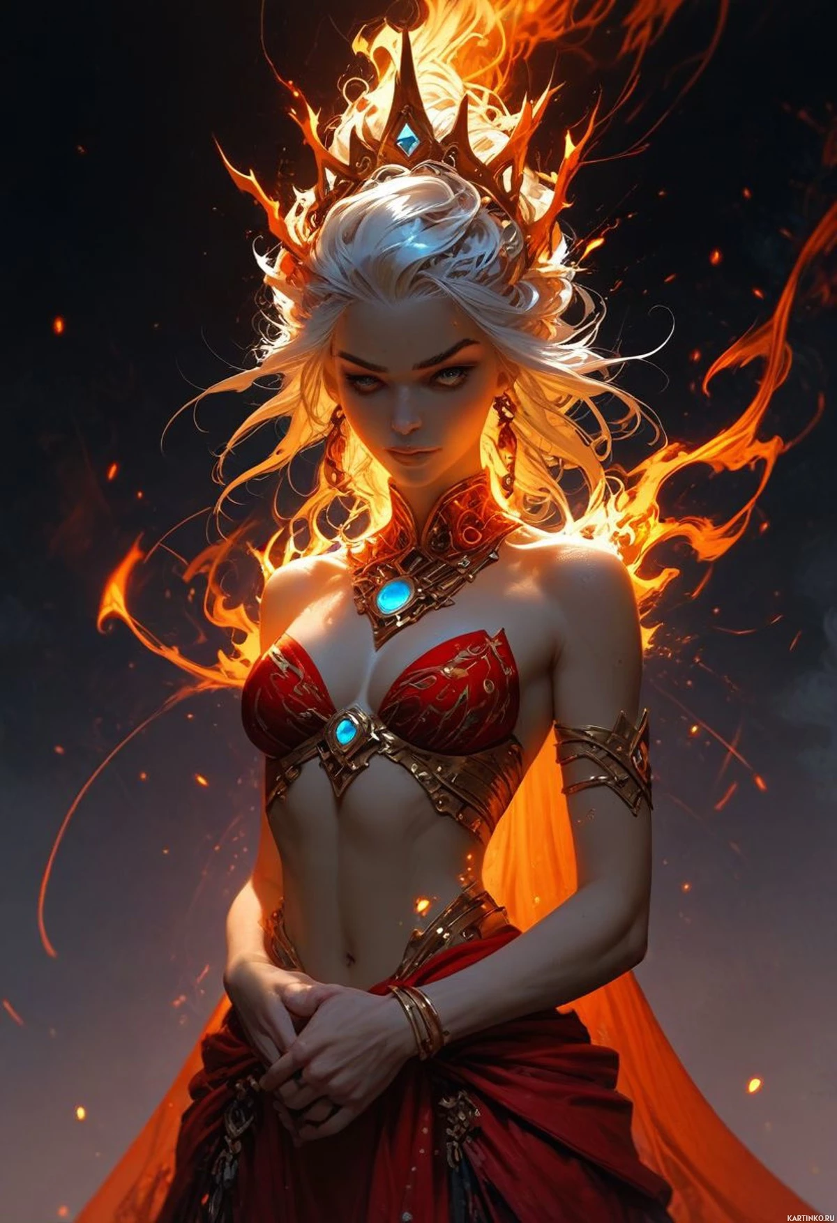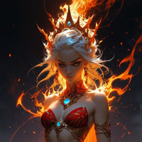На картинке изображена женщина с белыми волосами, словно языки пламени вырываются из-под них, что отсылает к образу "огненной короны". Она украшена различными украшениями и драгоценностями, напоминающими традиционный племенной или царский наряд. Её кожа кажется светящейся, что подчеркивает огненную тематику. Женщину окружает пламя, которое, кажется, исходит от неё самой, создавая эффектный образ, будто она — воплощение огненного элементаля. На её лице выражение уверенности, а на ней — красная одежда с дополнительными деталями, сочетающимися с общей огненной тематикой картинки.