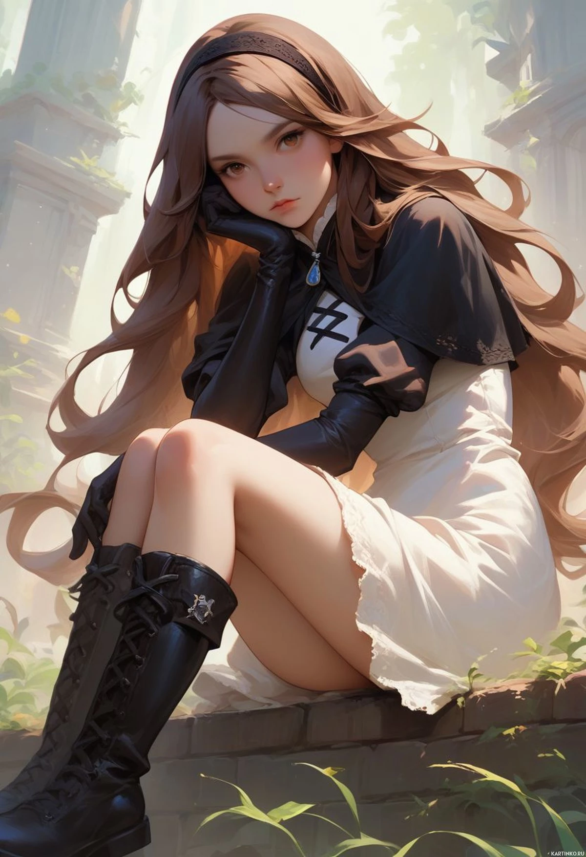 На картинке изображена молодая девушка с длинными темными волосами, сидящая на корточках на ступеньке. На ее лице легкая улыбка, и одна рука задумчиво приподнята к подбородку. Она одета в белую блузку с кружевной отделкой и черные леггинсы, дополненные черными ботинками. На заднем плане видны элементы классической архитектуры, такие как колонны и руины, создающие ощущение места, напоминающего древние цивилизации или фантастический мир. Стиль картинки – цифровая живопись или качественная иллюстрация, с акцентом на реалистичную детализацию черт лица и одежды.