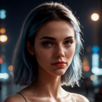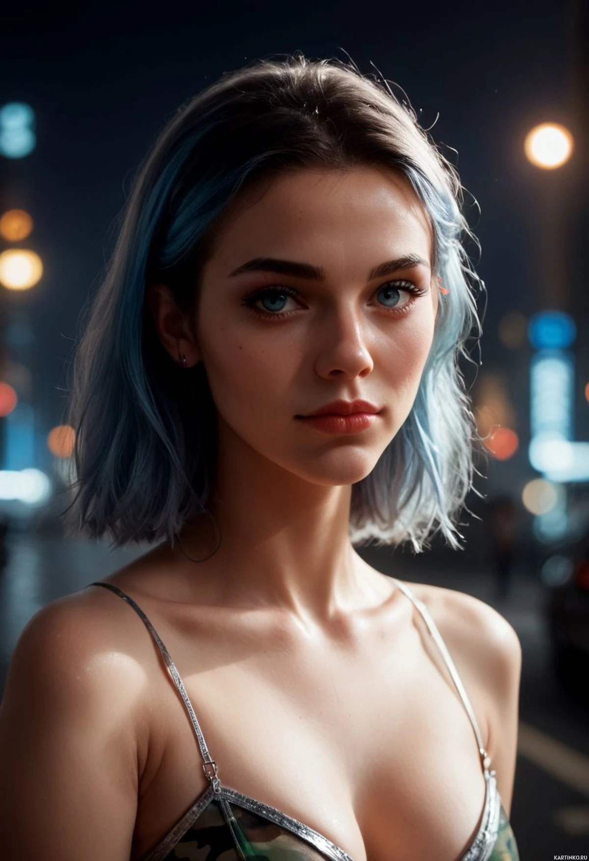 The image depicts a person with short blue hair standing in an urban street setting at night. The individual appears to be wearing a high-cut, metallic bikini top paired with what seems like a corset or bra-like garment on the torso. They have a neutral expression and are looking directly at the camera. In the background, there is neon lighting from surrounding establishments, which suggests it might be a commercial or entertainment district. The street is lined with vehicles parked along the curb and some buildings can be seen in the far distance.