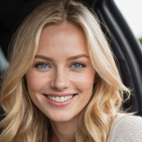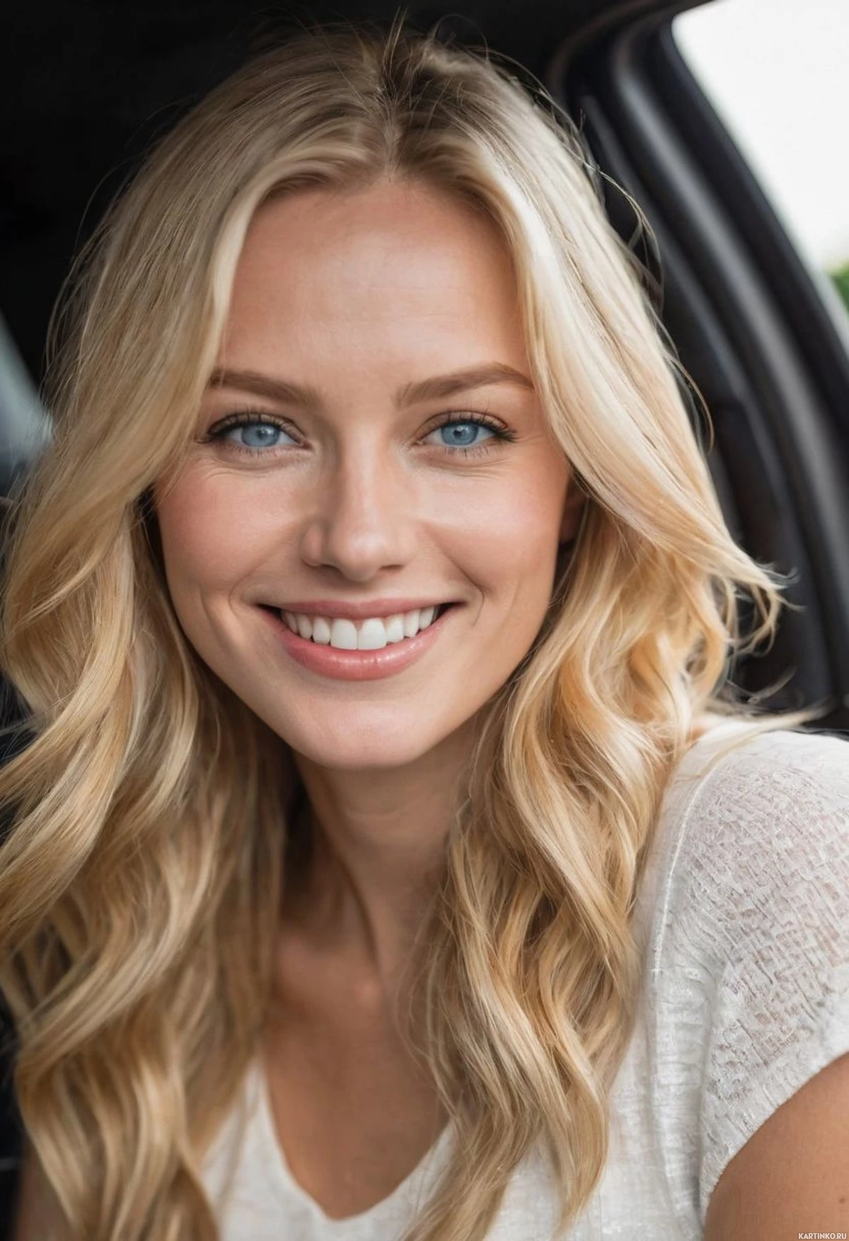 На картинке изображена женщина с светлыми волосами, похоже, она сидит в машине. На ее лице улыбка, и она смотрит прямо в камеру с приветливым выражением. Глаза у нее сияют, и она кажется расслабленной. На ней легкий топ или платье, что говорит о неформальной одежде, подходящей для теплой погоды. Фон размыт, но похоже на внутреннее пространство, возможно, салон автомобиля, с мягким рассеянным светом.