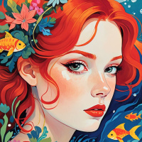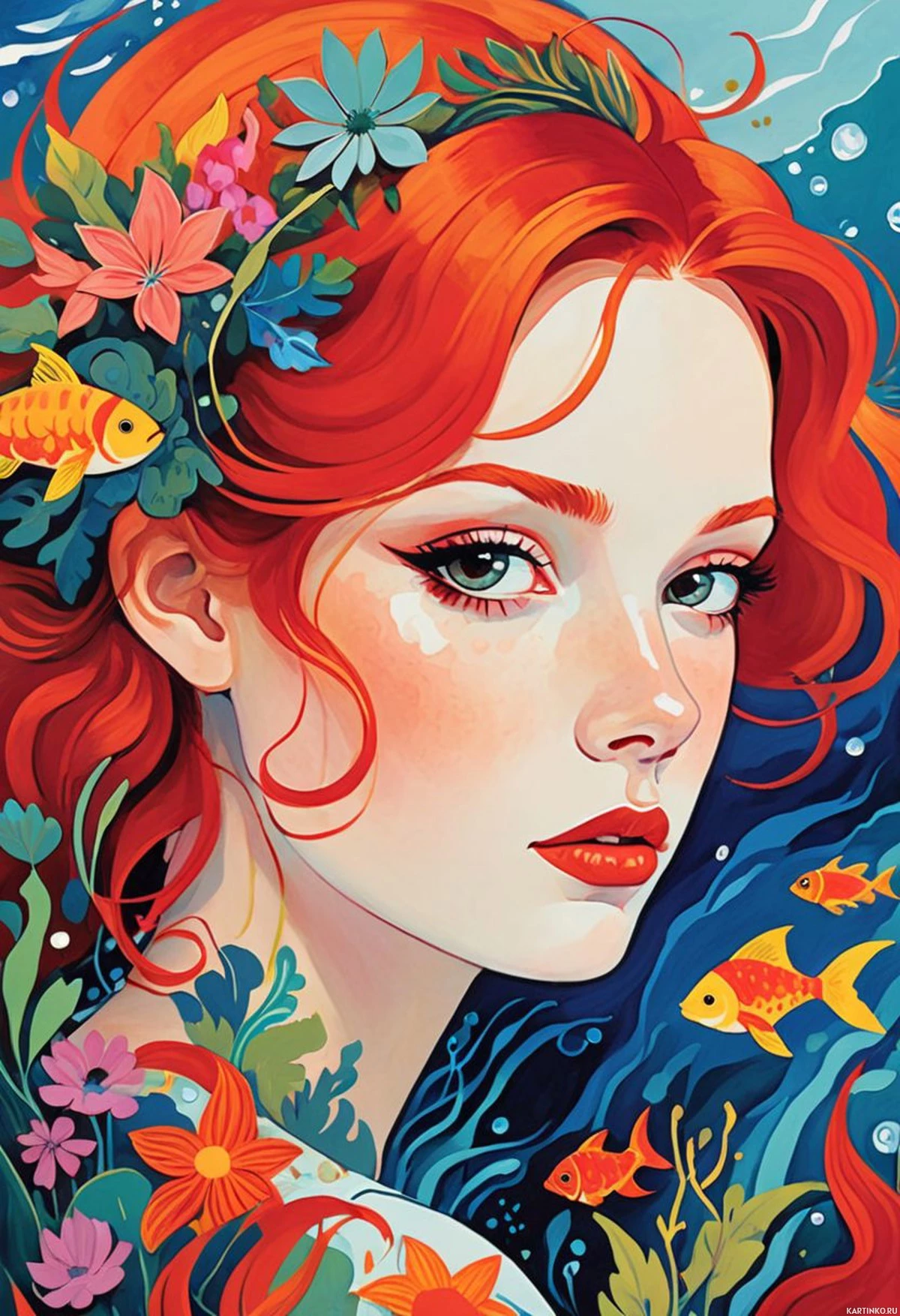 На картинке представлен цифровой арт с изображением девушки с рыжими волосами и светлой кожей. У нее большие голубые глаза и румяные щеки, а на лице – выражение спокойной задумчивости. Её губы слегка приоткрыты, словно она собирается что-то сказать или спеть. Волосы девушки ниспадают из пучка на голове, мягко обрамляя лицо. В её локонах видны маленькие цветы. На её ушах – нежные жемчужные серьги. Добавляя картинке неземной эффект, возле линии роста волос словно плавают маленькие рыбки и другие морские обитатели, как будто она находится в воде. Фон выполнен в глубоких сине-зеленых тонах, что создает атмосферу подводного мира и подчеркивает водную тематику. Цветовая палитра богатая и яркая, с оттенками розового, зеленого и синего, создающими сказочную атмосферу. Стиль работы тяготеет к фэнтези или сверхъестественному, что характерно для цифровых иллюстраций, стремящихся передать мистическое или потустороннее ощущение.