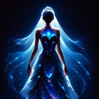 На картинке изображена фигура, похожая на девочку, в роскошном платье. У неё ниспадающие белые волосы, а фон – космическое пространство, усыпанное звёздами и туманностями. Платье украшено сложными узорами и орнаментами, близкими по цвету к космическим элементам, что создаёт гармоничный образ. Фигура расположена по центру композиции и смотрит прямо вперёд.