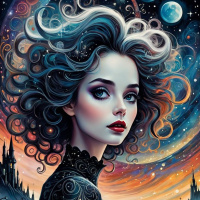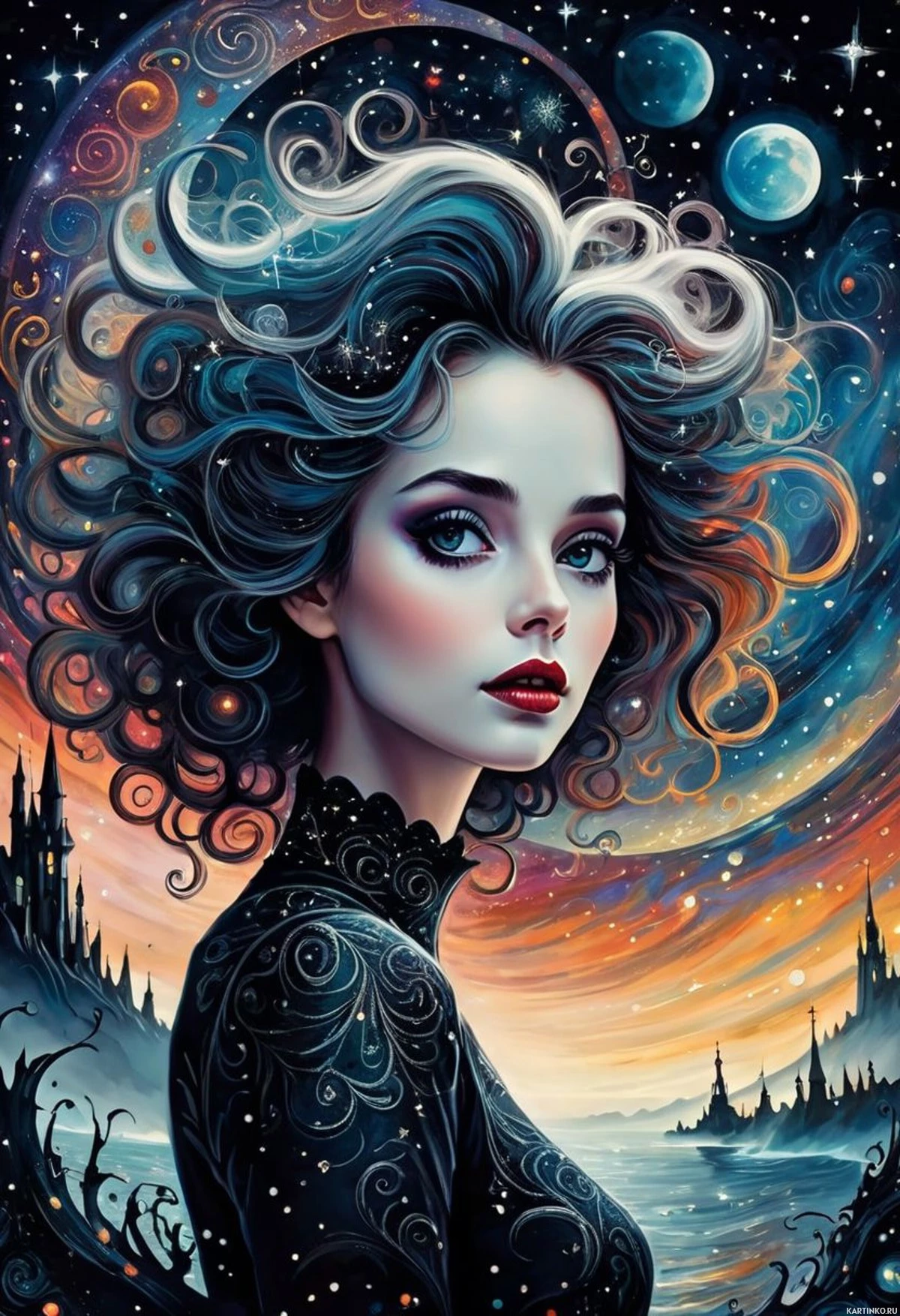 На картинке представлен стилизованный портрет женского персонажа. В центре – фигура с серебряными волосами, пронзительными голубыми глазами и выражением, которое кажется созерцательным или напряженным. На ней темный макияж глаз и сложный, изысканный наряд с замысловатыми узорами. За головой – облакоподобный элемент в оттенках синего и белого, напоминающий вихрь бури или небесное явление. Под лицом персонажа простираются неземные пейзажи, среди которых виднеется, кажется, замок на побережье с луной в небе. Цвета яркие, преимущественно холодные синие и теплые оранжевые.