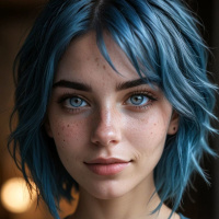 На картинке изображена девушка с волнистыми волосами до плеч, окрашенными в насыщенный синий цвет. У нее светлый тон кожи с легким розоватым оттенком на щеках. На лице – нейтральное выражение, взгляд прямой, губы слегка приоткрыты, видны зубы. На ней, похоже, джинсовый комбинезон, расстегнутый у воротника, что позволяет увидеть часть груди. Освещение создает выразитный контраст между освещенным лицом и более темным фоном.
