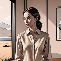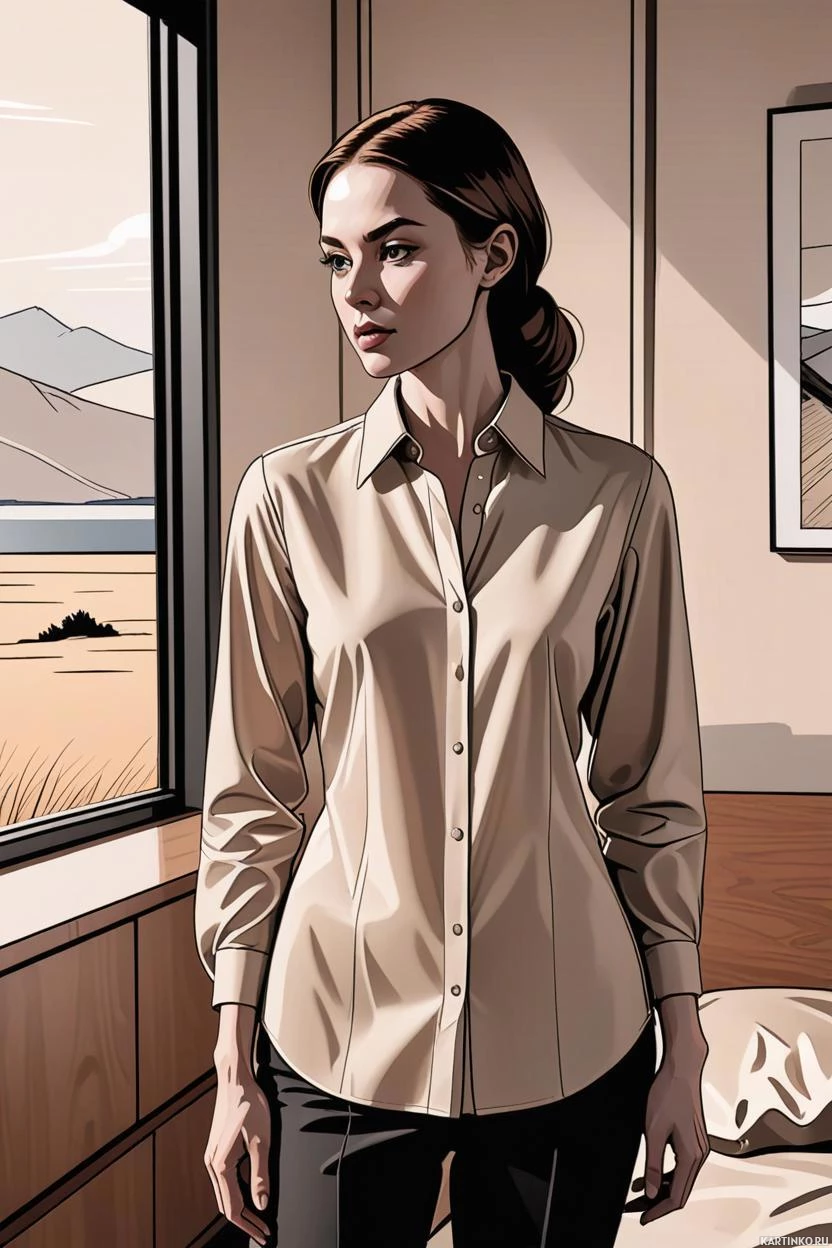 На картинке женщина с каштановыми волосами стоит у окна. На ней бежевая рубашка и черные брюки. Она смотрит в окно на живописный пейзаж, где видны горы и водоем вдалеке.