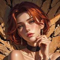 На картинке женщина лежит на потрескавшейся поверхности, покрытой грязью и песком. У нее длинные, волнистые рыжие волосы, ниспадающие на плечи. Ее лицо выражает нейтральное спокойствие, взгляд направлен в камеру. На ней темная одежда, которую можно принять как модный наряд или часть костюма. Макияж подчеркивает брови и тени, акцентируя внимание на прическе и создавая эффектный образ.