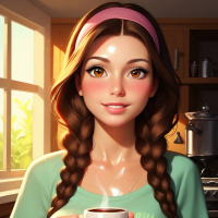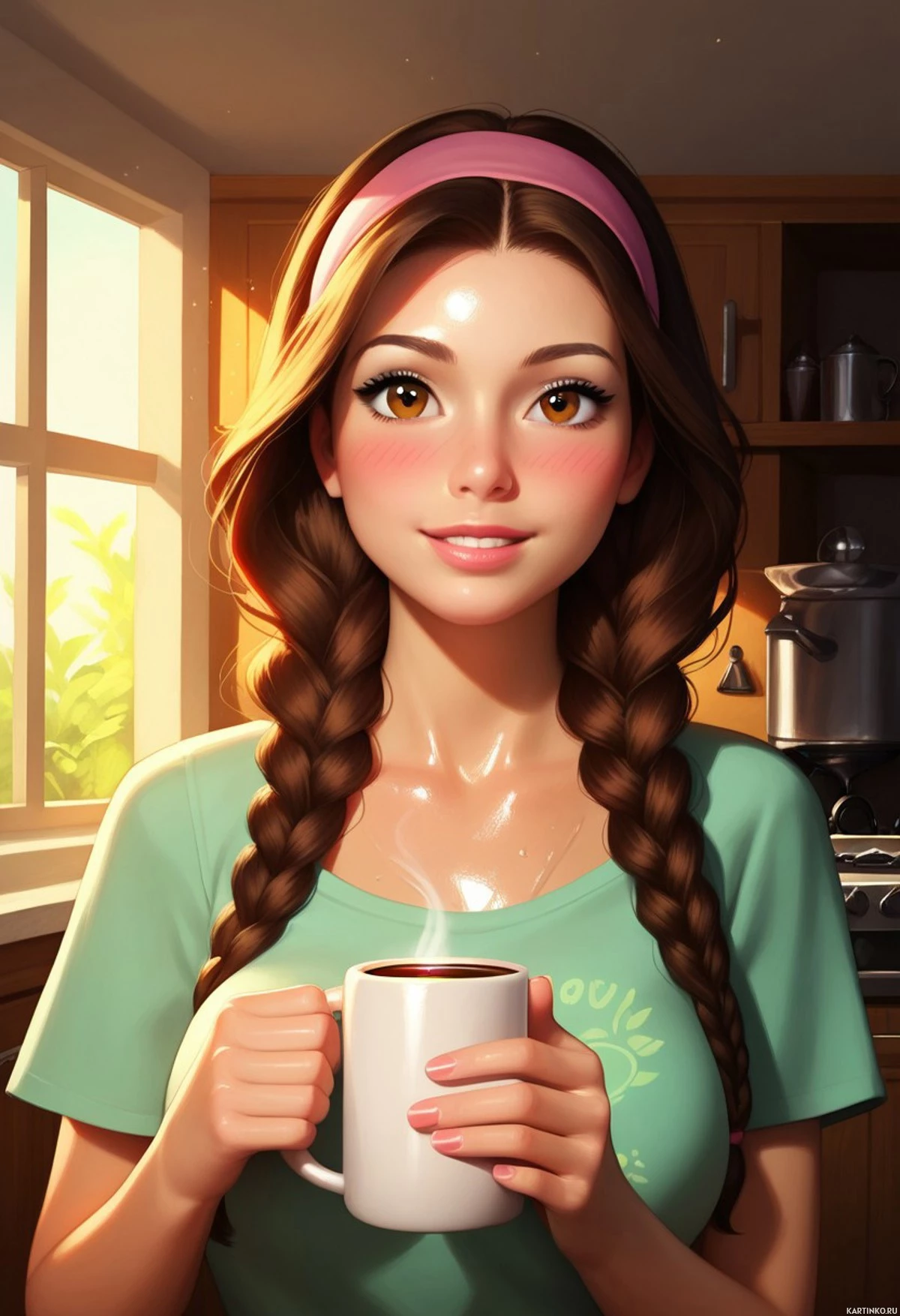 На картинке изображена девушка с молодым лицом, с тёмно-каштановыми волосами, заплетенными в две косы по бокам головы, и чашкой кофе в руках. На ней зелёная рубашка, а на шее – розовый бантик. Судя по мягкому освещению и деревянной отделке помещения, действие происходит либо рано утром, либо днём.
