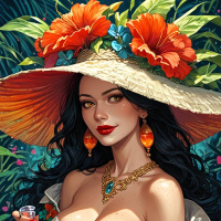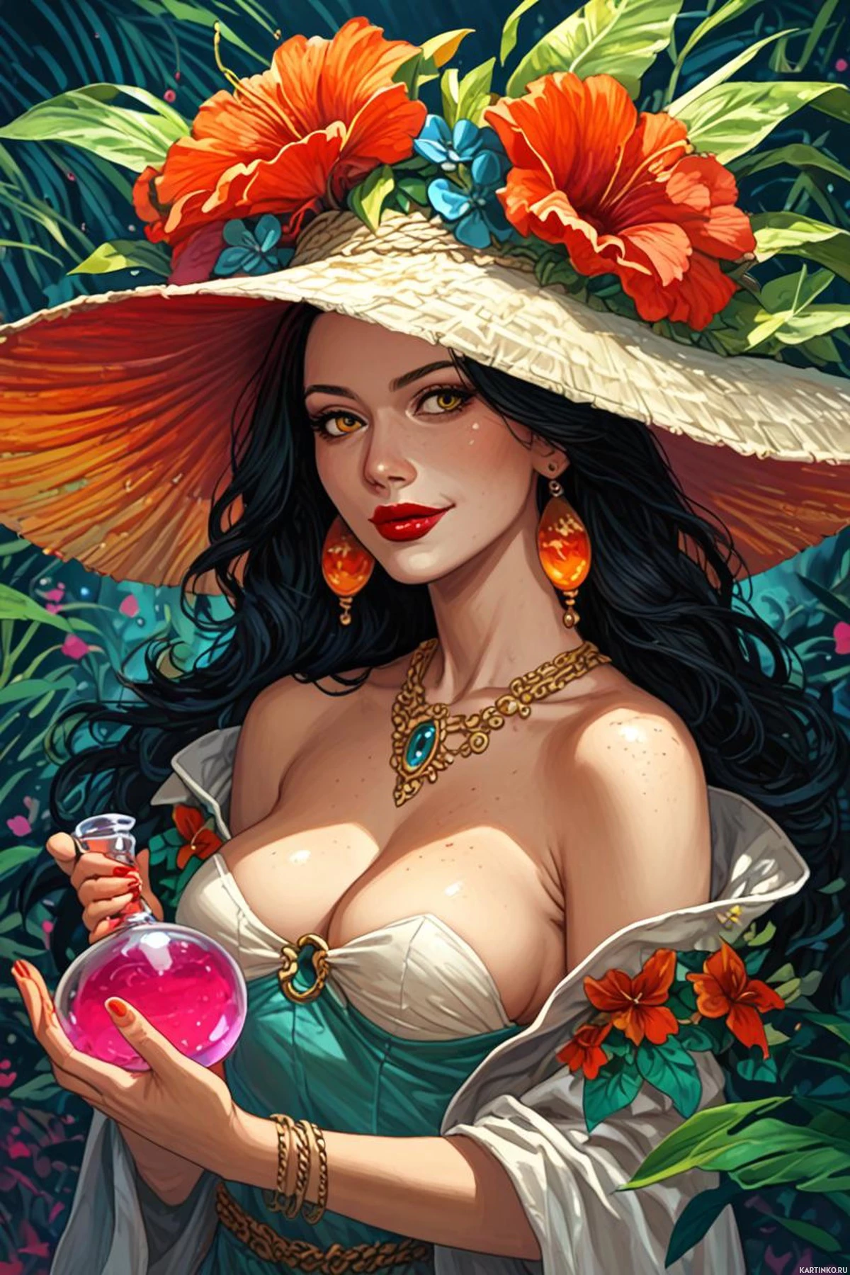 The image features a character with long dark hair and fair skin. She has red lips and wears an ornate hat adorned with colorful flowers. Her attire consists of a corset, which is detailed with gold accents. In her hand, she holds a glass flask that contains a purple liquid. The background includes green foliage and blossoming flowers in shades of red and pink.