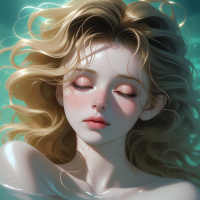 The image depicts a female figure with closed eyes, suggesting a state of relaxation or peacefulness. She has long blonde hair that appears wet, indicating she is in water. Her skin tone is fair and there are subtle details such as rosy cheeks and lips, which add to the soft and delicate appearance of her features. The background suggests an underwater environment, with small bubbles visible near the surface of what could be a pool or natural body of water.