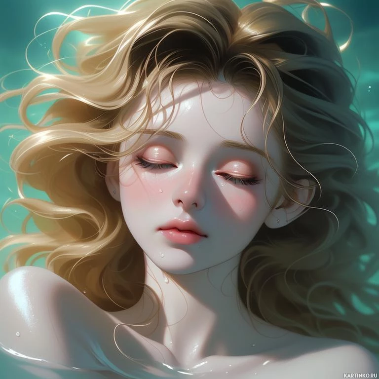 На картинке изображена женщина с закрытыми глазами, излучающая спокойствие и умиротворение. У неё длинные светлые влажные волосы, что говорит о том, что она находится в воде. Её кожа светлая, а нежные детали, такие как лёгкий румянец на щеках и губах, придают её чертам мягкости и деликатности. На заднем плане просматривается подводная среда, с небольшими пузырьками воздуха, поднимающимися к поверхности бассейна или водоёма.