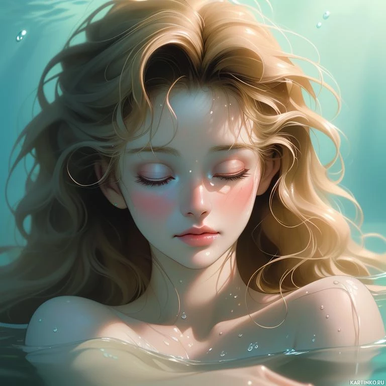 На картинке изображена девушка с светлыми волосами. Её глаза нежно закрыты, и она кажется расслабленной или, возможно, спит. Вода, доходящая до уровня чуть ниже плеч, окружает её, а на поверхности видны пузырьки, намекающие на движение. Фон представляет собой плавный градиент от светло-голубого вверху до белого внизу, что может указывать на подводное окружение.