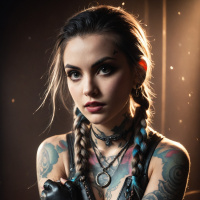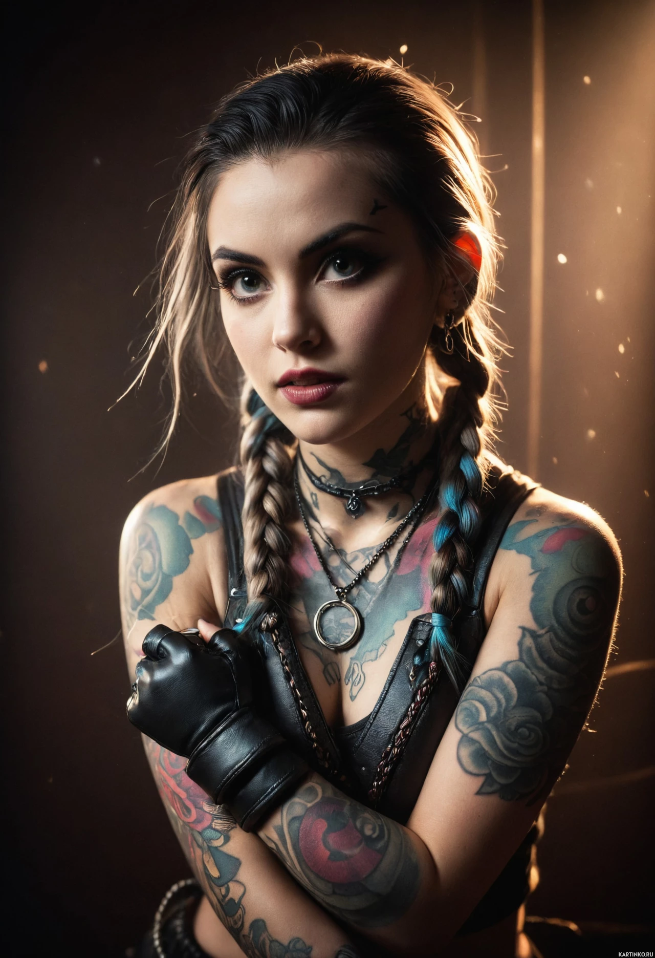 На картинке – молодая женщина с татуировками на руках и плечах, она в центре внимания. У неё тёмные волосы, заплетённые в косы, украшенные, кажется, цветочным аксессуаром. Макияж включает в себя дугообразные брови и розовые губы. На руках у неё черные перчатки без пальцев, а на шее – чокер с красными розами. Она одета в топ, напоминающий корсет, с видными бретельками, и держит руки сложенными возле груди. Фон нейтральный, освещение приглушенное, всё это акцентирует внимание на девушке.