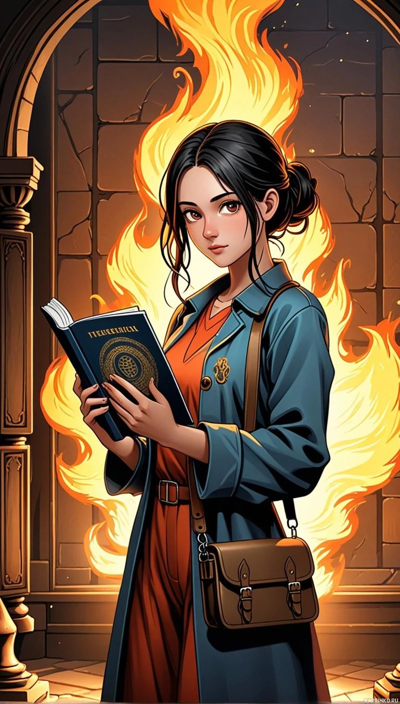 На картинке молодая женщина с темными волосами, кажется, читает книгу. На ней длинное пальто, а на лице – выражение сосредоточенности. За её головой бушует пламя, создавая эффектный фон. Место, где она находится, выглядит как старинное или историческое, возможно, руины, судя по каменным стенам позади неё.