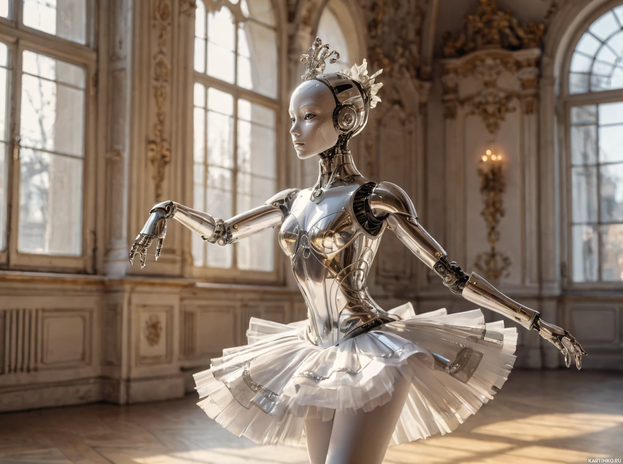 На картинке изображен робот, словно танцующий. Он антропоморфной формы и одет в одежду, сочетающую металлические и органические элементы. Робот стоит в роскошной комнате, возможно, в бальном зале, с огромными окнами, через которые проникает естественный свет. Поза робота передает ощущение движения, улавливая суть танца.