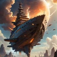 Картинка изображает фантастическую сцену, разворачивающуюся в эпичном пейзаже, где элементы научной фантастики сочетаются с мотивами классического искусства. В центре композиции возвышается огромный, древний корабль, напоминающий галеон или корабль для перевозки сокровищ из эпоху открытий. Это судно разбилось о каменистый берег на краю, по-видимому, водной поверхности – океана или моря. Над ним – драматическое небо, затянутое темными тучами и с намеком на молнии, что создает ощущение бурной, штормовой ночи. На заднем плане – величественные скалы и каменные образования, вызывающие ощущение древней и таинственной местности. Луна ярко выделяется в верхнем левом углу, заливая всю сцену своим светом и подчеркивая драматическое освещение. В правом нижнем углу просматриваются отблески зелени – возможно, растительность или кустарники, контрастирующие с суровостью окружающего каменистого ландшафта. Корабль серьезно поврежден; его корма разбита и погружается в воду, в то время как нос остается частично над поверхностью. На заднем плане линия горизонта также демонстрирует признаки разрушения или износа – части зданий обрушены или находятся в руинах. Несмотря на это, картинка излучает чувство величия и эпического масштаба, характерные для фэнтезийных работ, сочетающих разные исторические эпохи и элементы воображения.