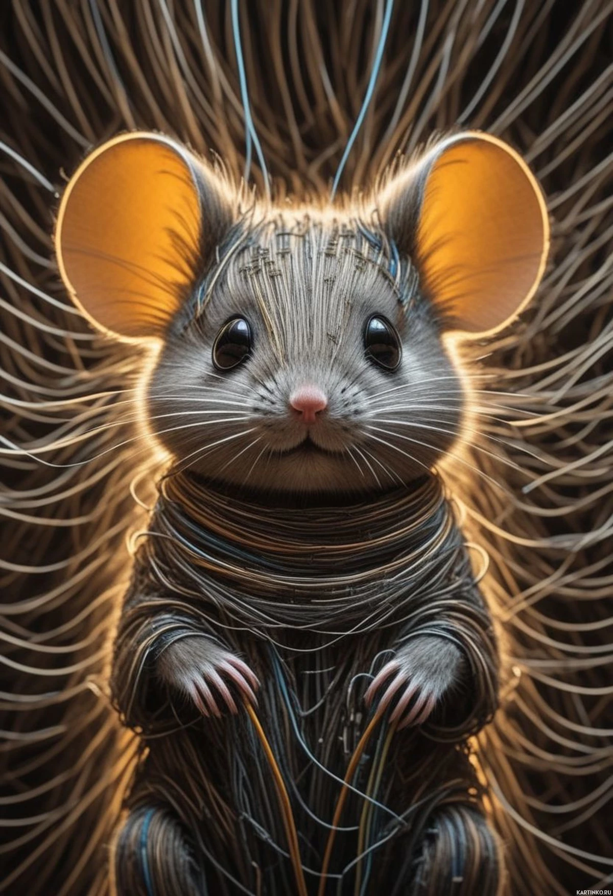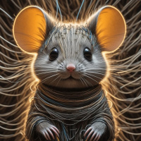 На картинке изображен стилизованный мышонок с большими выразительными глазами и взъерошенной шерстью, будто его застигла какая-то энергия или движение. У мышонка немного потрёпанный вид, что намекает на его зрелость или опыт. Он стоит на двух лапах, одетый в что-то вроде рваной ткани или робы, а вокруг него переплетены металлические провода или нити. Освещение в картинке создает неземную или сюрреалистичную атмосферу с выразительными бликами и тенями, падающими на мордочку и шерсть мышонка.