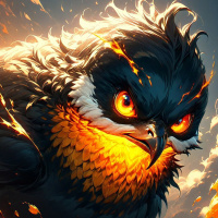 The image features a digital illustration of an owl with flames emanating from its body, suggesting a fiery character trait or power. The owl is depicted in profile view, facing towards the left side of the image, with its eyes glowing with fire. It has feathers that are detailed with texture and color variations, giving it a lifelike appearance despite the fantastical elements. The background behind the owl appears dark, possibly representing night or shadowy surroundings. There is a sense of motion around the flames as if they are in full combustion.