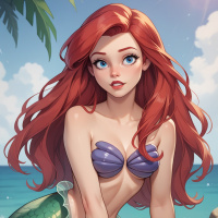 The image features an animated character known as Ariel, who is a mermaid from the animated movie "The Little Mermaid." She is sitting on a rock by the ocean with her tail visible, suggesting that she is in her mermaid form.