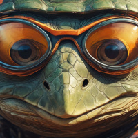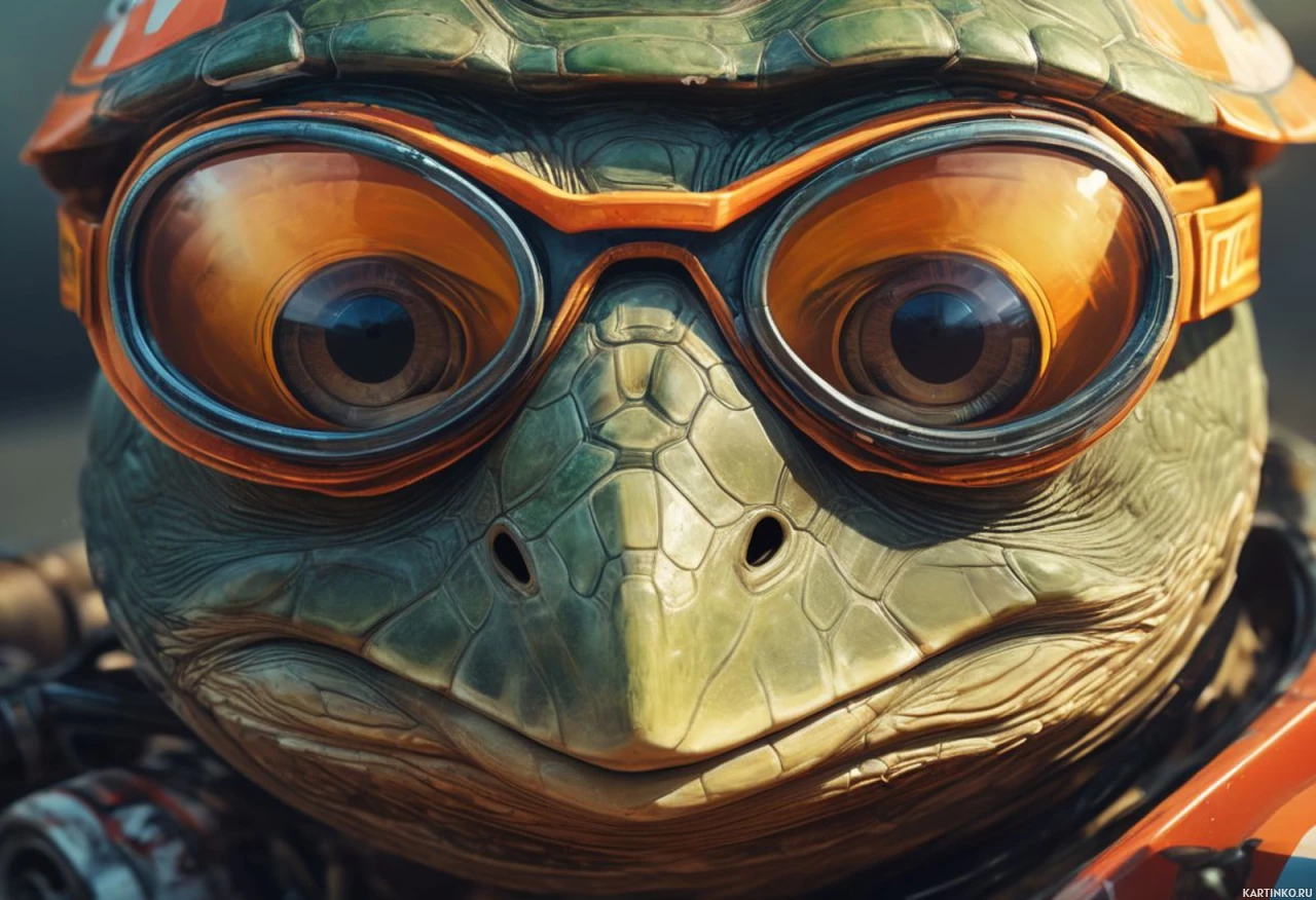 На картинке изобращена скульптура черепахи в очках и солнцезащитных очках с оранжевыми линзами. У черепахи ярко-красная голова, заключенная в оранжевые доспехи, сделанные из металлолома или других промышленных материалов. Выражение на морде черепахи задумчивое и созерцательное, она смотрит немного вправо.