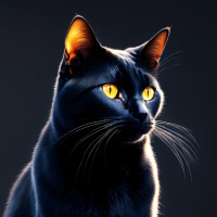 На картинке изображён чёрный кот с ярко-жёлтыми глазами, сидящий на тёмном фоне. Выражение его мордочки сосредоточенное и внимательное, он смотрит прямо перед собой, будто полон любопытства или ожидания. Шерсть блестит, что говорит о хорошем уходе. У кота стройное телосложение, а его усы заметно выделяются, добавляя портрету элегантности.