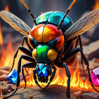 На картинке выделяется крупный жук с яркой окраской, переходящей от красного к зелёному и синему. У жука шесть лап и два крыла, он стоит в позе настороженности. Кажется, у него светятся глаза, подсвечивающие всё вокруг. На заднем плане – резкий контраст: пламя, окрашенное в оранжевые и жёлтые тона. Эти языки пламени создают впечатление источника огня, расположенного чуть выше жука. Вся сцена разворачивается на каменистой поверхности, усыпанной камнями и щебнем, частично скрытыми пламенем, что говорит об интенсивном жаре или, возможно, вулканической среде. Кроме того, в воздухе рядом с жуком парят небольшие разноцветные шарики, похожие на драгоценности. Они добавляют сказочности тому, что могло бы казаться огненной и опасной сценой. Их присутствие может намекать на то, что это художественное или магическое изображение, а не реальный мир.