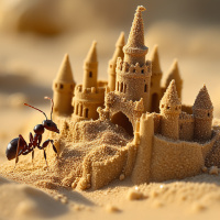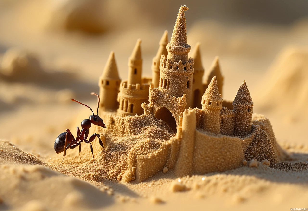 На картинке возвышается песчаный замок, доминирующий над пустынным пейзажем. Он украшен множеством башен и арочными окнами, придающими ему внушительный и сказочный вид. Песчаная поверхность вокруг замка испещрена следами, возможно, от ветра или животных, что добавляет её рустовому очарованию. Перед замком ползет маленький муравей, пробираясь сквозь песок. Справа в кадре, на камне сидит птица, голубого цвета, наблюдая за происходящим. Цвета на картинке тёплые и естественные, земляные оттенки песка контрастируют с синевой неба. Эта картинка запечатлевает интересное взаимодействие дикой природы и рукотворных сооружений в суровых условиях пустыни.