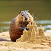 In the picture, there is a beaver that appears to have constructed a small sandcastle. The beaver is sitting on the sand, which has been molded into a neat pile of bricks. There are