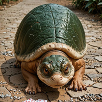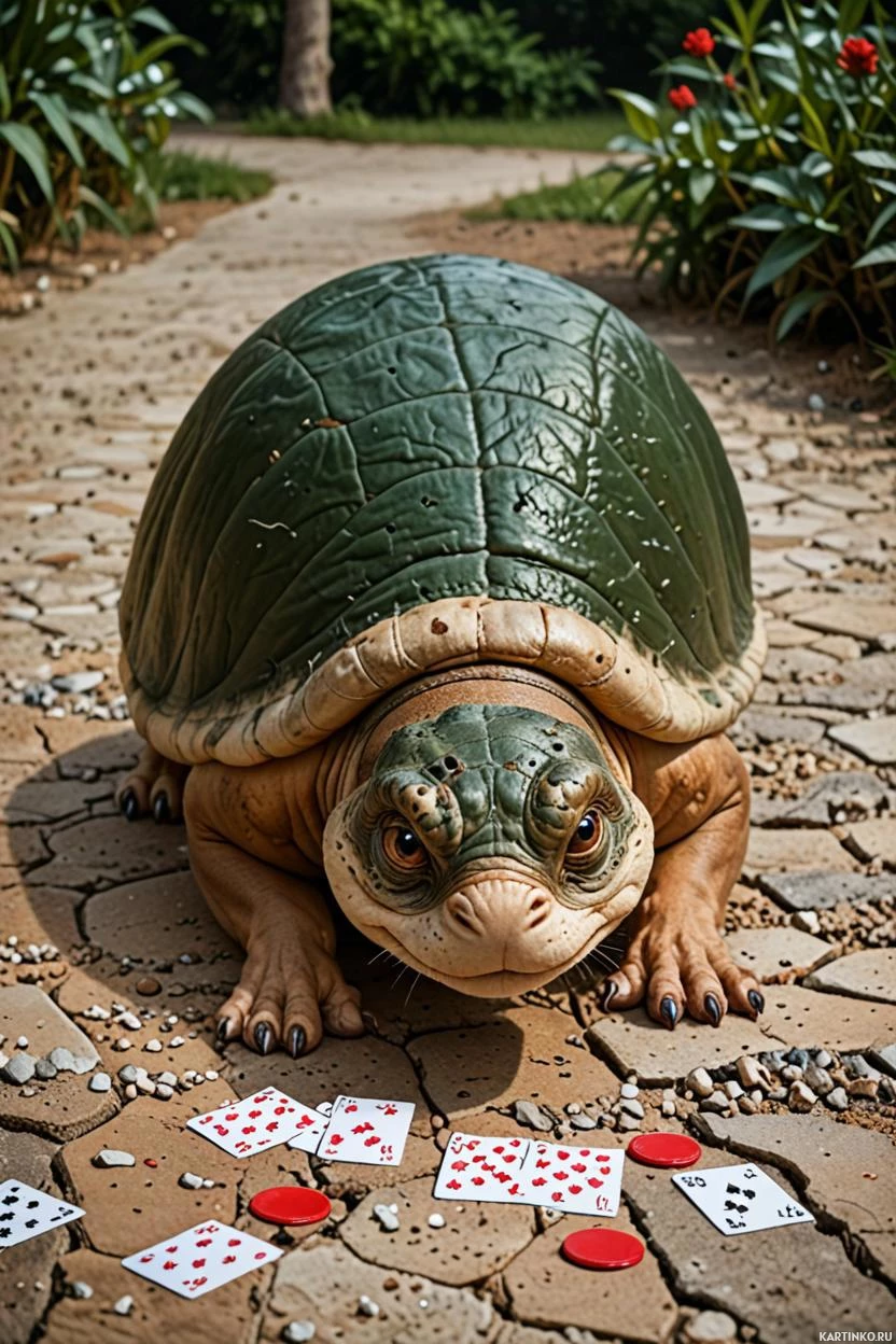 На картинке изображена черепаха, сидящая на кирпичной дорожке. У черепахи детальный узор на панцире, с оттенками коричневого и зеленого, что говорит о реалистичном изображении животного. Перед черепахой лежат игральные карты, сложенные в узор, напоминающий кости или абстрактную композицию, создавая причудливый эффект. Рядом с картами небольшой стопка красных предметов, похожих на подставки или фишки, и несколько покерных фишек, разбросанных вокруг. На заднем плане - пейзаж с зеленью и деревьями, что указывает на сад или парк.