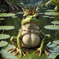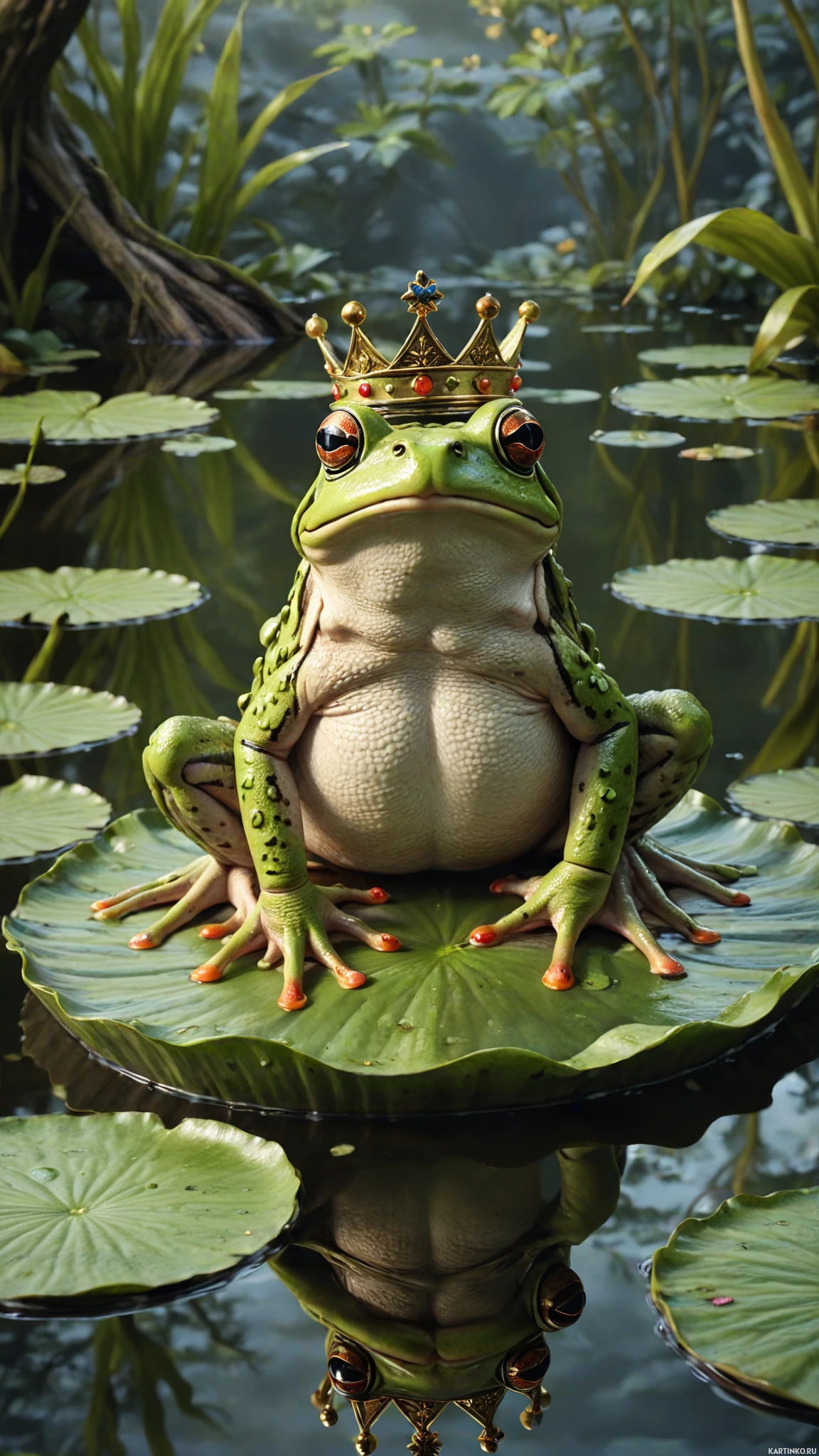 Картинка изображает лягушку в короне, восседающую на большом кувшинке, плывущей в пруду. У лягушки яркая зеленая кожа с темными пятнышками, а на голове – маленькая золотая корона. На заднем плане – спокойная, природная обстановка, словно утренний туман или роса, придающие сцене умиротворяющую атмосферу.
