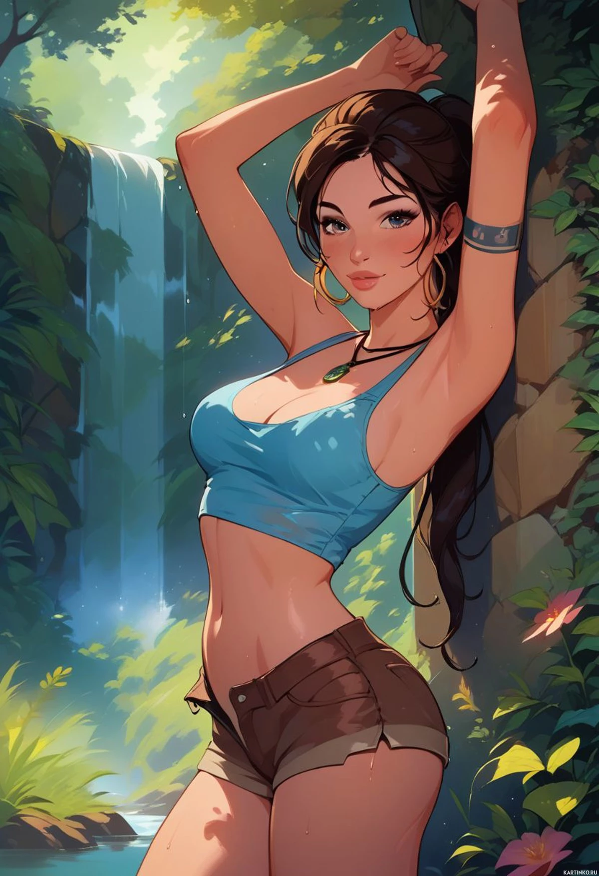 a rock wall, which appears to be part of a waterfall cascade in the background. The character is wearing a blue