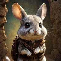 На картинке изображен антропоморфный кролик, стоящий в полный рост. У него большие, заостренные уши и выразительные глаза с голубыми акцентами, что придает ему дружелюбный и авантюрный вид. На нем коричневый плащ с пуговицами и рюкзак за спиной. Лапы сжаты, словно он держит какой-то предмет или посох. Персонаж находится на фоне стилизованного окружения, похожего на старое, разрушенное здание или руины, с текстурированной поверхностью, намекающей на возраст и историю.