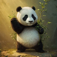The image depicts a stylized representation of a panda bear. It has large, round eyes and is standing upright on two legs. The background features a serene natural setting with trees and rocks, one of which appears to be a piece of wood or bamboo in the panda's hand, suggesting its natural habitat.